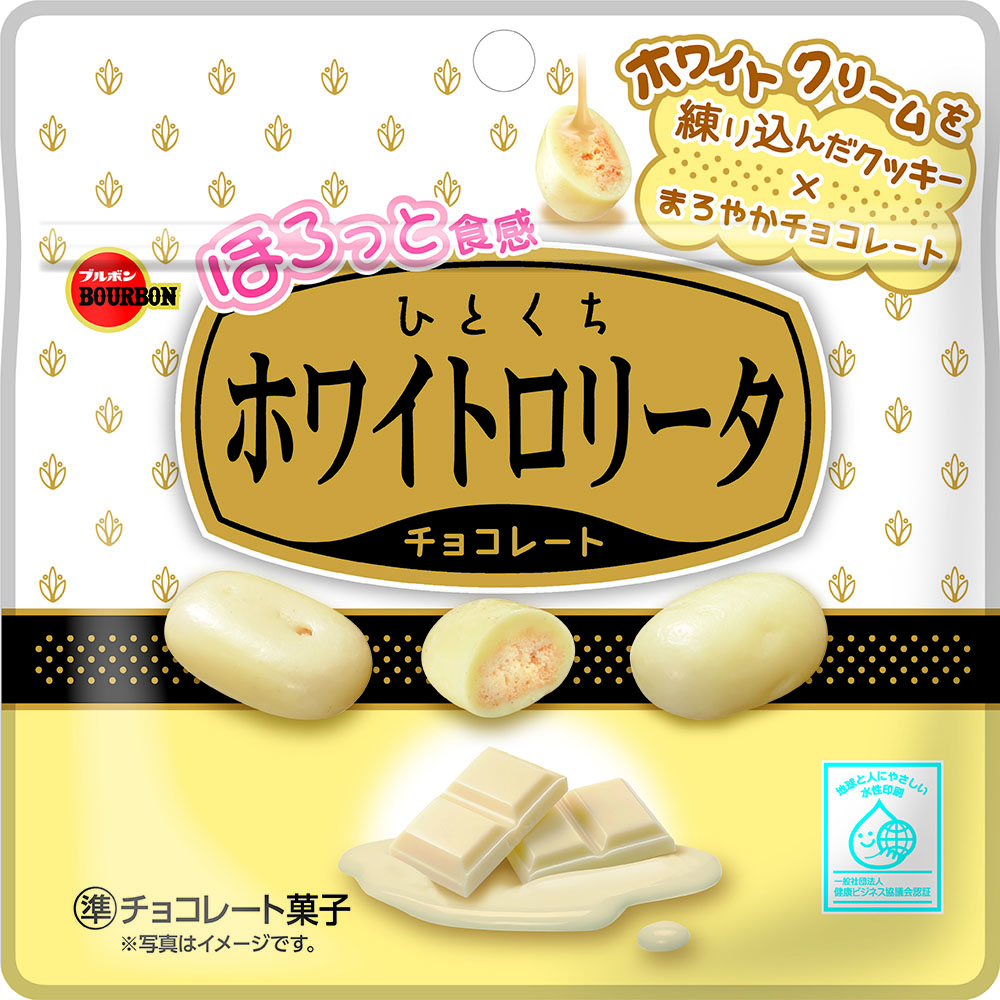 「ひとくちホワイトロリータ」は、ホワイトクリームを練り込んだ 「ほろっと」食感のクッキーに、まろやかな甘さのクリーミーなホワイトチョコをコーティングしたひとくちサイズのホワイトロリータです。